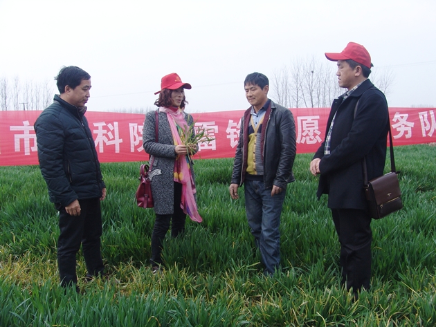 我院小麥專(zhuān)家周?chē)诟毖芯繂T對當地50多名農民群眾進(jìn)行了小麥中后期田間管理技術(shù)的培訓,講解了分類(lèi)施肥、預防倒春寒、及時(shí)清溝降漬、防治病蟲(chóng)害等小麥中后期田間管理的關(guān)鍵技術(shù),并對他們在種植過(guò)程中提出的各種問(wèn)題給予了詳細的解答。培訓結束后,市農科院專(zhuān)家們還來(lái)到道明種植業(yè)合作社小麥種植基地,查看了土壤墑情和小麥苗情,周?chē)诟毖芯繂T還對其中一塊小麥因除草劑使用不當造成的黃苗、死苗現象進(jìn)行了現場(chǎng)講解,根系發(fā)育不良、分蘗減少、株高降低、葉片發(fā)黃、嚴重影響產(chǎn)量,這些因人為因素導致的藥害癥狀觸目驚心,極大地震撼了在場(chǎng)的每一個(gè)人,也使大家深刻認識到科學(xué)種田的重要性。