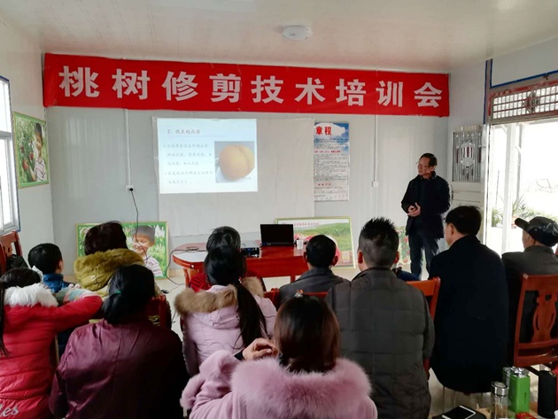 在馬畈鎮觀(guān)五玫小雜果農業(yè)專(zhuān)業(yè)合作社,專(zhuān)家們?yōu)楹献魃缂夹g(shù)人員和周邊桃樹(shù)種植戶(hù)舉辦了一場(chǎng)桃樹(shù)標準化生產(chǎn)技術(shù)培訓會(huì ),現場(chǎng)講解冬季桃樹(shù)修剪技術(shù)和水肥管理技術(shù),并發(fā)放了技術(shù)資料。對種植戶(hù)不易掌握的不同樹(shù)齡、不同枝條的修剪方法,專(zhuān)家又帶領(lǐng)大家前往桃園,進(jìn)行實(shí)地操作指導,手把手傳授Y字形、自然開(kāi)心形和主干形桃樹(shù)等省工化修剪技術(shù)。專(zhuān)家的培訓進(jìn)一步增強了當地群眾種好桃樹(shù)、脫貧致富的信心,受到了他們的熱烈歡迎。