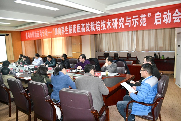 2月22日下午,由我院承擔的信陽(yáng)市創(chuàng )新應用專(zhuān)項“豫南再生稻優(yōu)質(zhì)高效栽培技術(shù)研究與示范”的啟動(dòng)會(huì )在浉河賓館召開(kāi),我院院長(cháng)段仁周、市科技局副局長(cháng)張向華出席會(huì )議,我院再生稻研發(fā)團隊成員、商城縣農業(yè)農村局負責同志以及信陽(yáng)再生稻米品牌創(chuàng )建及產(chǎn)業(yè)開(kāi)發(fā)合作企業(yè)代表等20余人參加了會(huì )議。會(huì )議由我院總農藝師段斌同志主持。