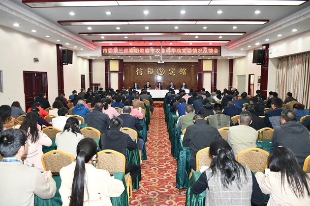 11月14日,市委第三巡察組巡察市農業(yè)科學(xué)院黨委情況反饋會(huì )在信陽(yáng)賓館多媒體會(huì )議廳召開(kāi)。市委巡察工作領(lǐng)導小組成員、市委巡察辦主任張冬梅出席會(huì )議并講話(huà),市委第三巡察組組長(cháng)曹深山、副組長(cháng)徐桂蘭、副組長(cháng)劉建平及工作人員,駐市農業(yè)農村局紀檢監察組組長(cháng)周應傳及工作人員,市農科院機關(guān)全體人員及近三年來(lái)退休的職工代表參與會(huì )議。市農業(yè)科學(xué)院黨委書(shū)記李杰主持會(huì )議。