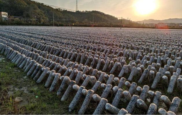 秋高氣爽,信陽(yáng)市浉河區的水稻已收割完畢,在董家河鎮、游河鄉的一些稻茬田里,整齊地擺滿(mǎn)了代料黑木耳的菌棒,一排排白色的耳棒上擠滿(mǎn)了茁壯生長(cháng)的黑木耳,田野里一片豐收的景象。