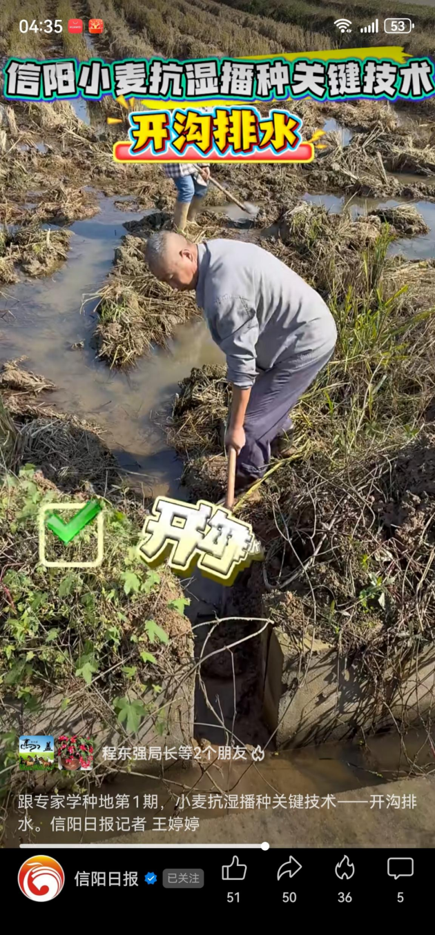 在與多個(gè)種麥大戶(hù)溝通指導的過(guò)程中,周?chē)诜磸蛷娬{田間排水散墑、藥劑拌種、增加播量的的重要性,并在品種選擇和肥料施用等方面提供了建議,號召大家樹(shù)立“搶”的意識,擯棄“一等二看”的思想,發(fā)揮主觀(guān)能動(dòng)性,因地制宜、適耕細播。