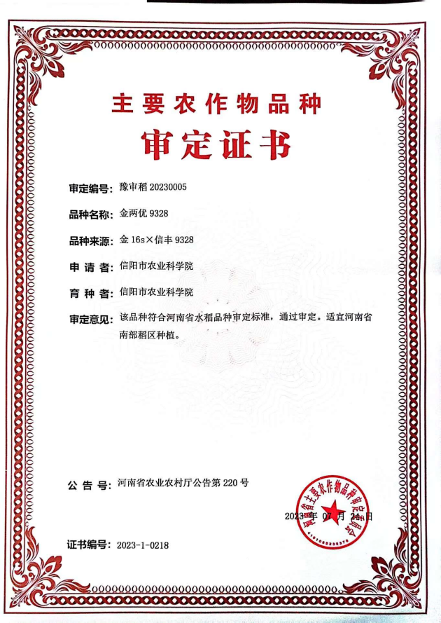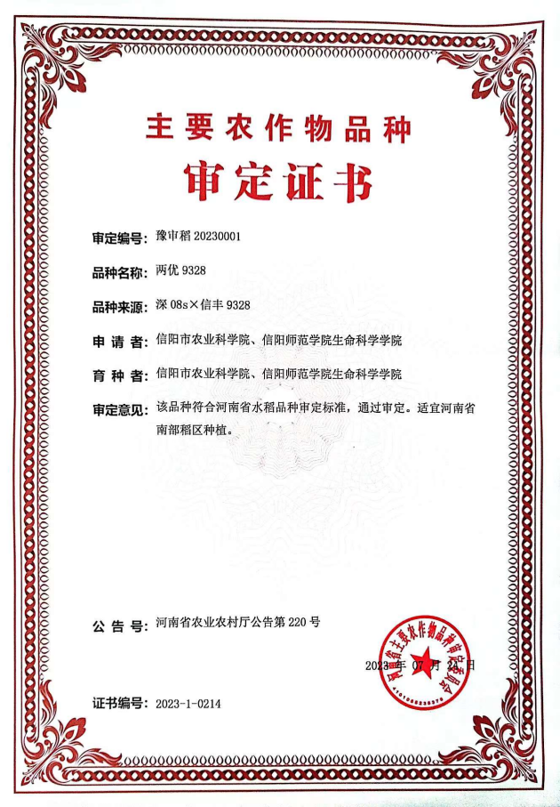 兩優(yōu)9328(審定編號:豫審稻20230001)屬兩系雜交稻新品種。全生育期142天,株高115.4厘米,平均畝有效穗16.7萬(wàn)穗。2022年參加生產(chǎn)試驗,平均畝產(chǎn)稻谷699.0公斤。稻米品質(zhì)達部標優(yōu)質(zhì)二級標準,適宜在河南省南部稻區種植。