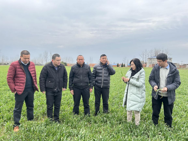 “雨水”剛過(guò),春暖乍寒,正是小麥春管時(shí)。目前信陽(yáng)小麥已經(jīng)返青,由南向北逐漸進(jìn)入起身期,此期是決定小麥畝穗數、穗粒數,為小麥搭好豐產(chǎn)架子的關(guān)鍵時(shí)期。為保證今年夏糧豐收,我院國家小麥產(chǎn)業(yè)技術(shù)體系信陽(yáng)綜合試驗站站長(cháng)周?chē)趲ьI(lǐng)團隊一行先后赴息縣、淮濱、羅山、平橋區等地,深入田間地頭查看小麥苗情、診斷病情, 根據麥田不同表現現場(chǎng)為農戶(hù)提供技術(shù)指導服務(wù),因苗因類(lèi)因病分類(lèi)施策,助力春季麥田管理 。